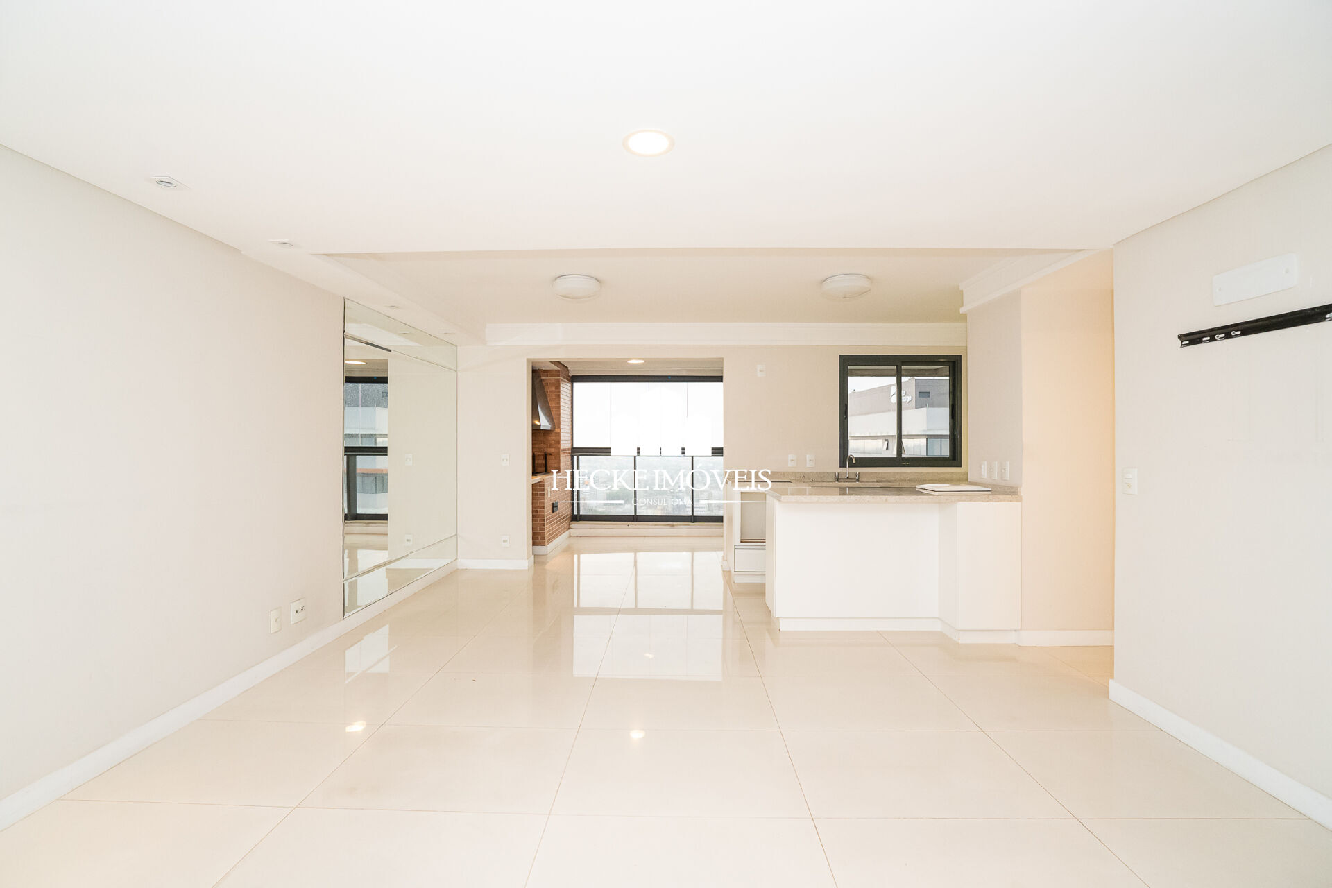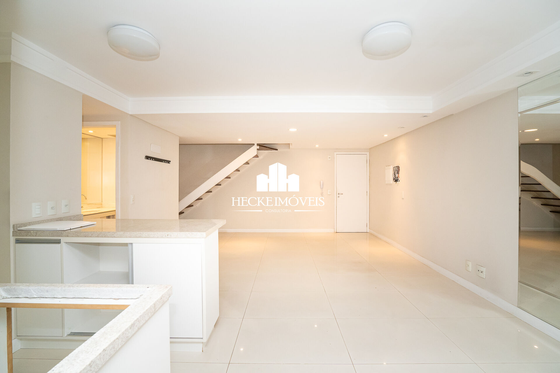 - Salas de estar e jantar com piso porcelanato, gesso rebaixado com iluminação;